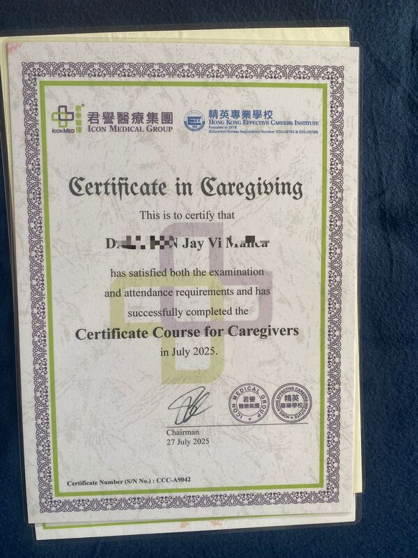 Before Im working in Taiwan as caregiver for 12 yrs.I have a care giver certificate and first Aids.