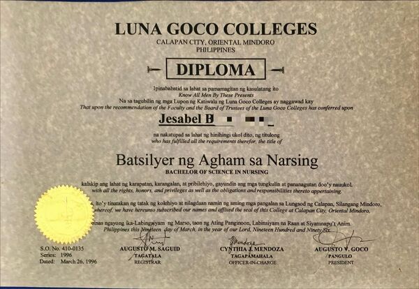 Bachelors of Science in Nursing degree from the Philippines